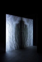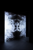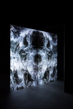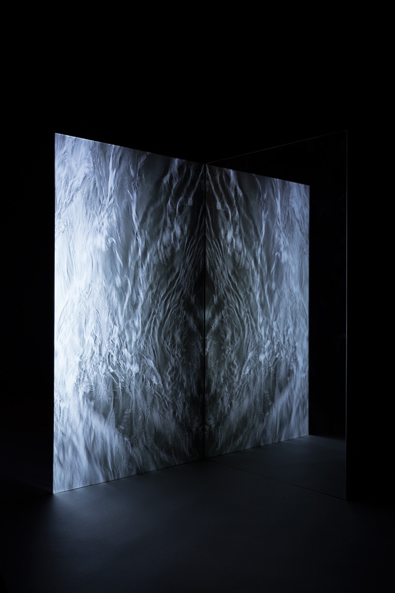 “The video installation Uncanny River (The Crossing), 2014-2015, chronicles the voyage across a wide river from shore to shore. The projection shows a continuous image of churning water, made by the turbulent wake of the ship, whilst the vessel itself, and the riverbank from which it has departed remain out of shot. The horizontal camera position is rotated by the artist so as to present the viewer with a vertical picture, which is then back-projected onto a sheet of black glass, with a mirror, set at a right angle, duplicating the swirling liquid. The lugubrious double image has the hypnotic quality of a maelstrom, drawing our attention into its depths.”
