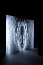 “The video installation Uncanny River (The Crossing), 2014-2015, chronicles the voyage across a wide river from shore to shore. The projection shows a continuous image of churning water, made by the turbulent wake of the ship, whilst the vessel itself, and the riverbank from which it has departed remain out of shot. The horizontal camera position is rotated by the artist so as to present the viewer with a vertical picture, which is then back-projected onto a sheet of black glass, with a mirror, set at a right angle, duplicating the swirling liquid. The lugubrious double image has the hypnotic quality of a maelstrom, drawing our attention into its depths.”